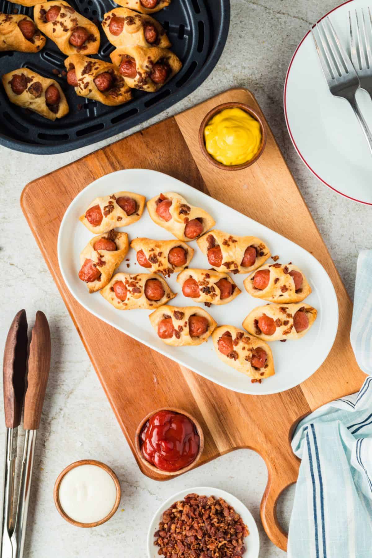 - For some cheesy deliciousness, you can top the assembled pigs in a blanket with shredded cheddar cheese instead of bacon crumbles- like I did when I made my Air Fryer chili cheese dogs.