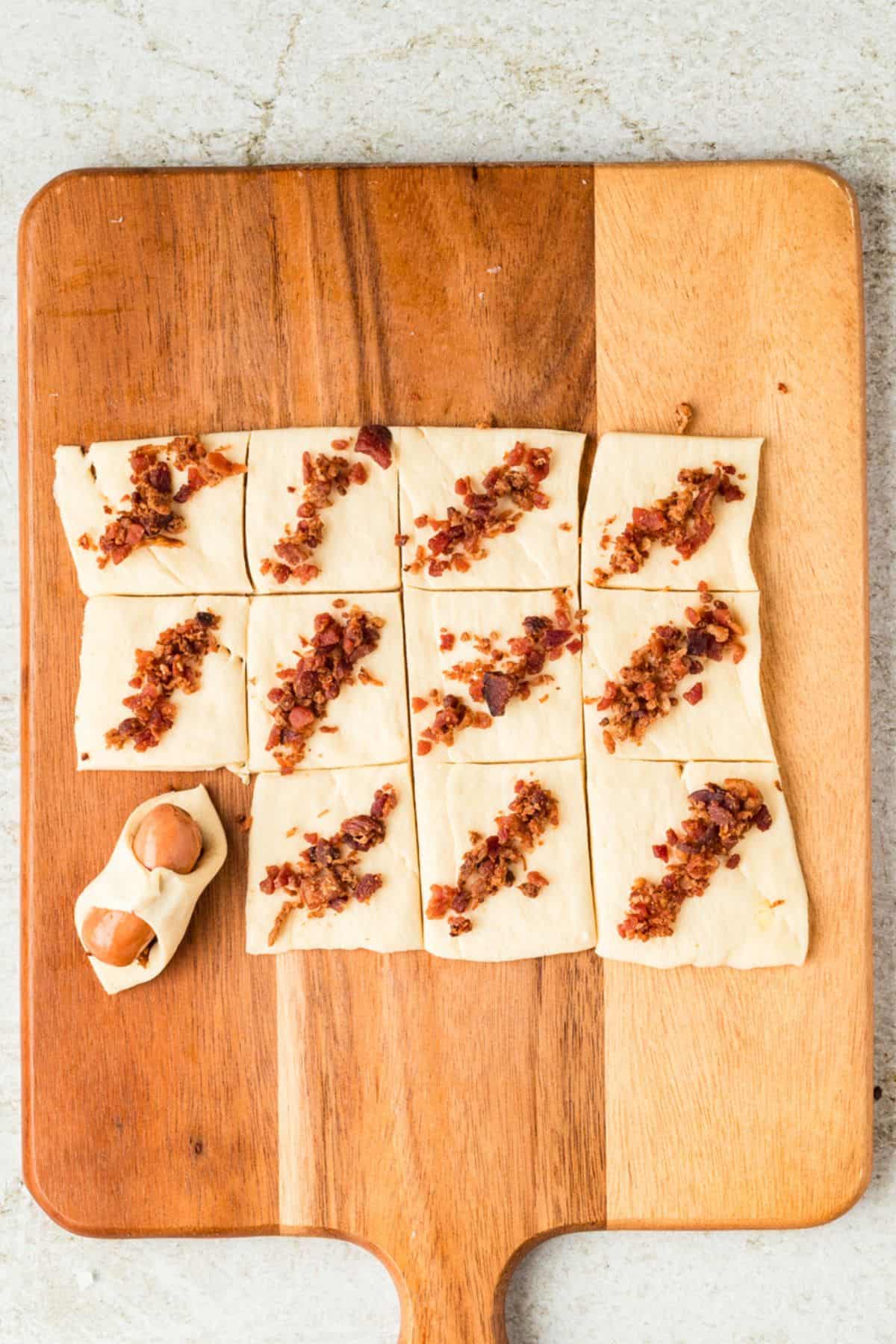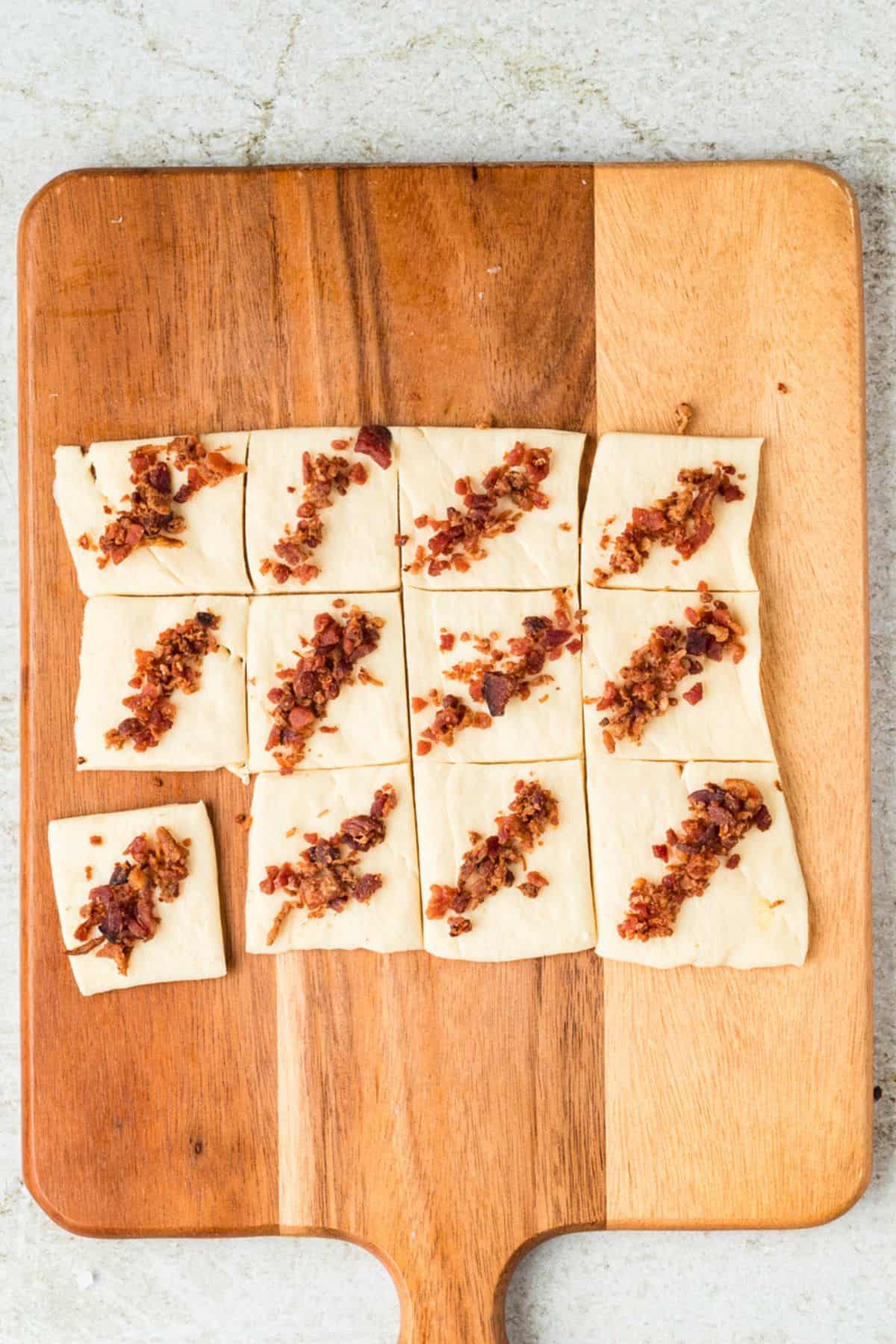 - Place a small amount of the bacon crumbles in the middle of each dough square (just enough to form a bacon layer under the hot dog and prevent overfilling the dough).