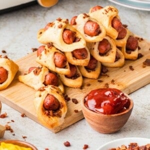 These crispy air fried bacon pigs in a blanket taste incredible on their own or paired with a nice dipping sauce. You can keep it simple and use some ketchup or mustard, or even try some maple syrup or hot honey for a bit of a sweet twist.