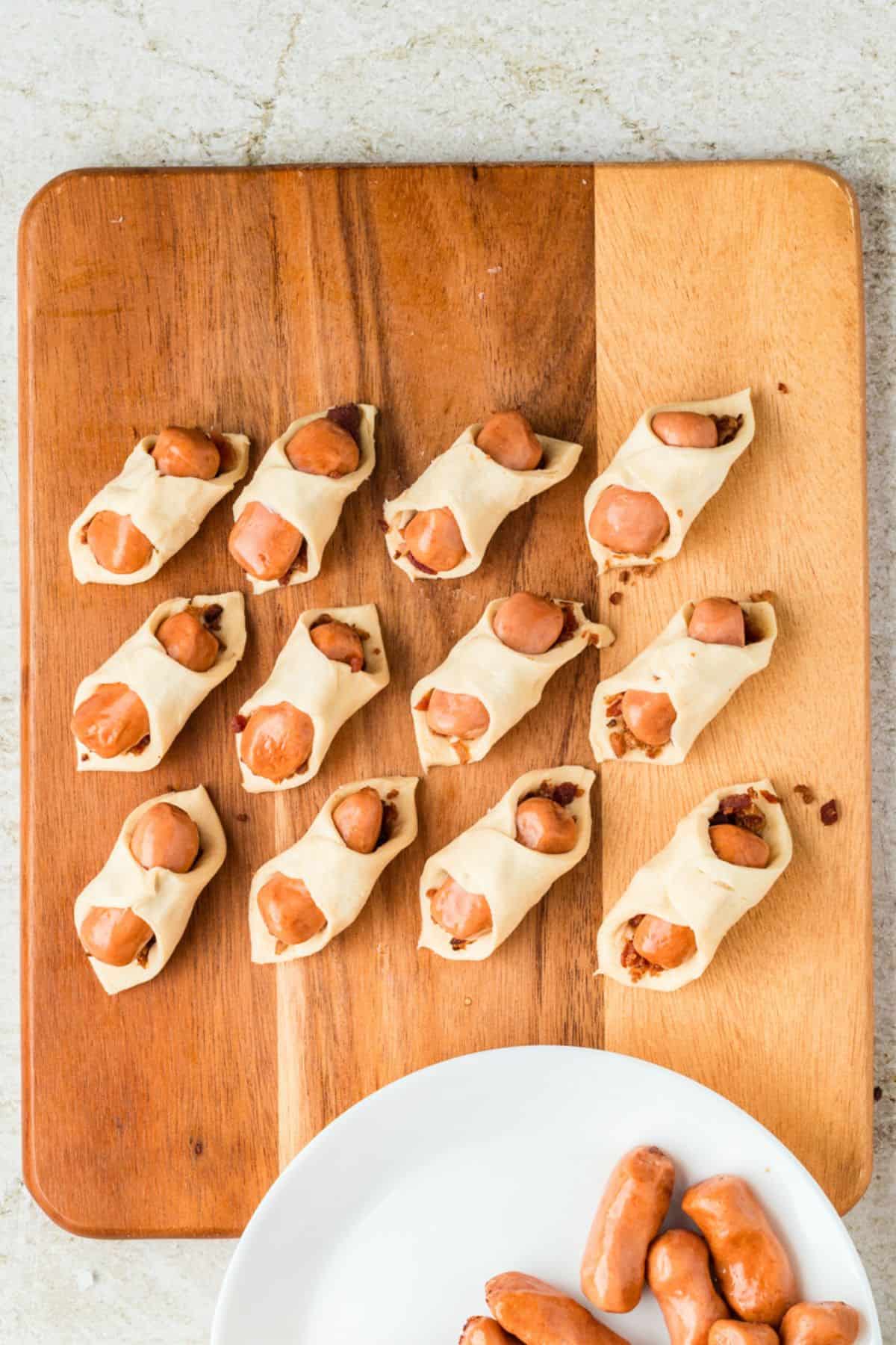 - Immediately sprinkle additional bacon crumbles on top of the pigs in a blanket and lightly press the bacon down onto the dough (so that it sticks).