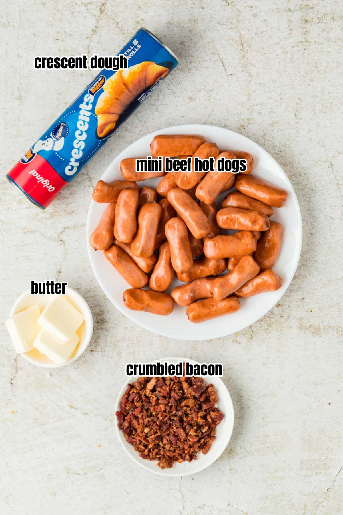 - Mini hot dogs: I used mini beef hot dogs here, but you can also use cocktail sausages or any other mini sausages of your choice.