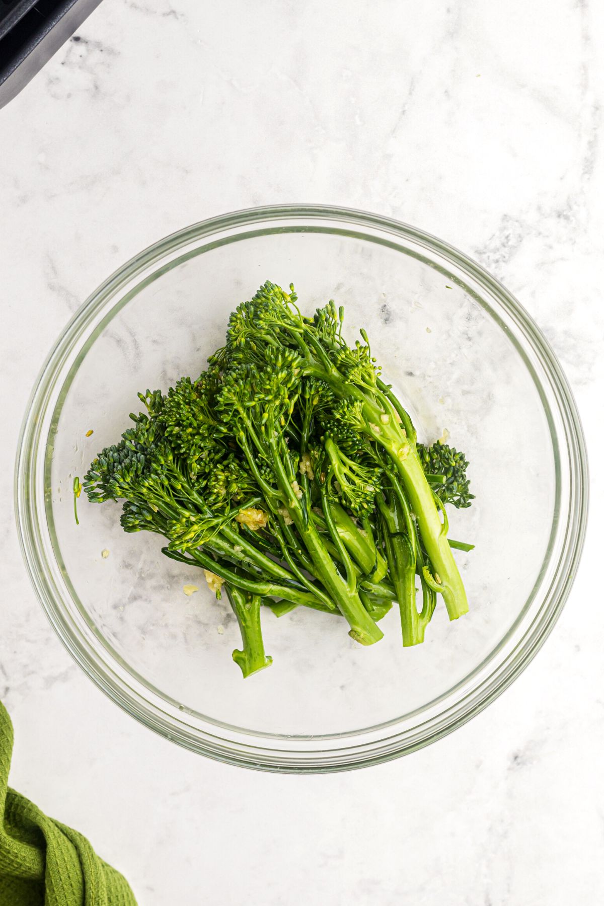 - Start by rinsing and chopping the broccolini stems and patting them dry with a paper towel. Add them to a bowl with the olive oil, garlic and seasonings.