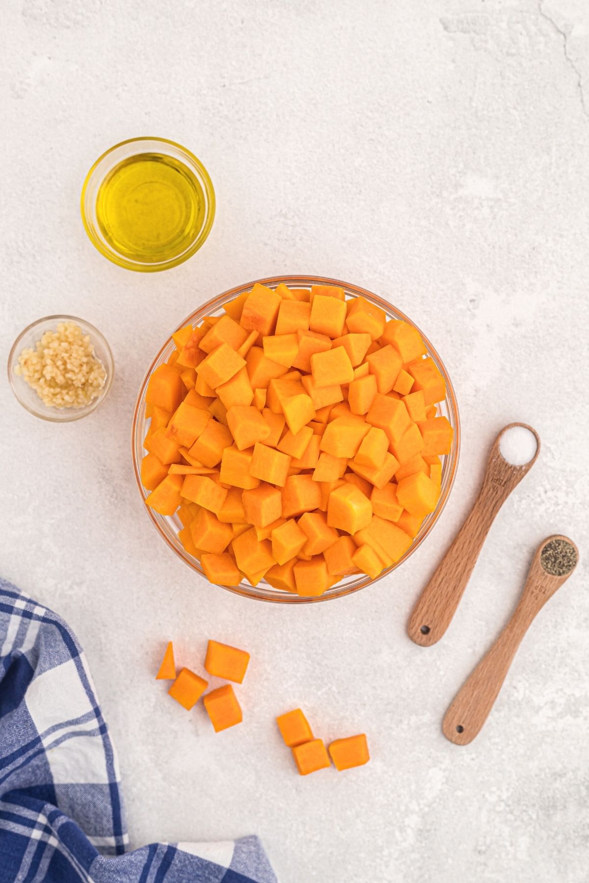 - In a medium or large bowl, add the butternut squash cubes, and toss the squash with olive oil and seasonings.