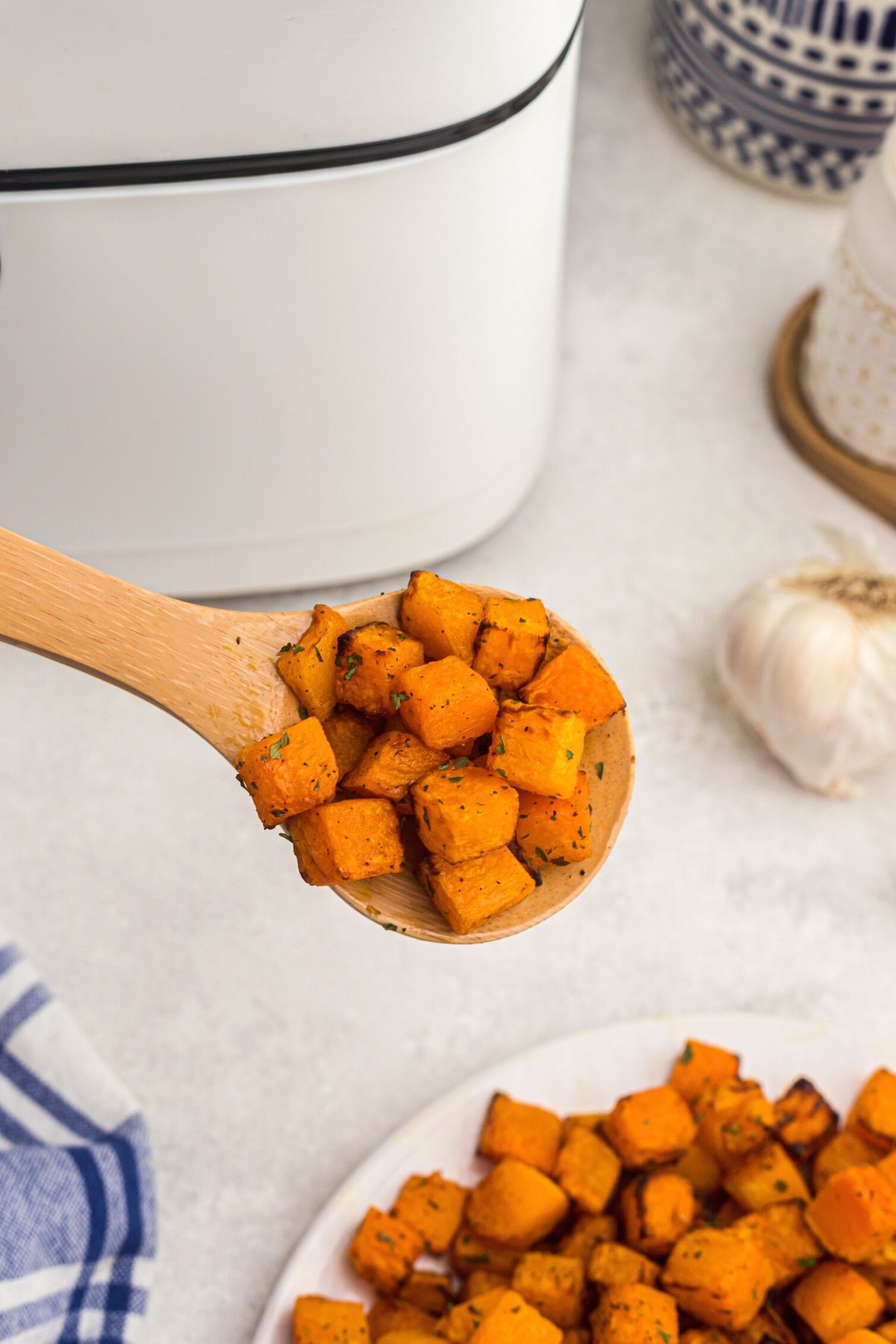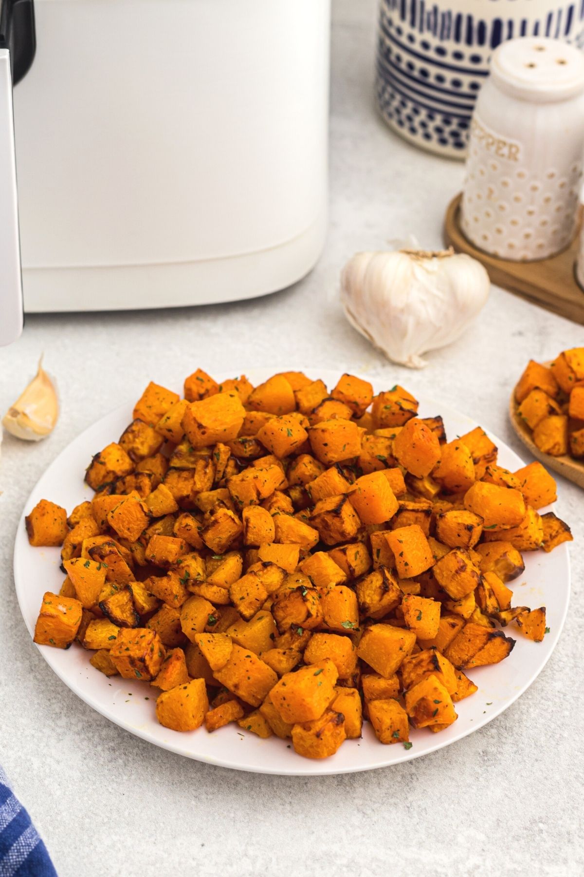 Air fried butternut squash work great as a side dish with mains like Air Fryer duck, my favorite Air Fryer lamb chops, and even my Air Fryer whole chicken.