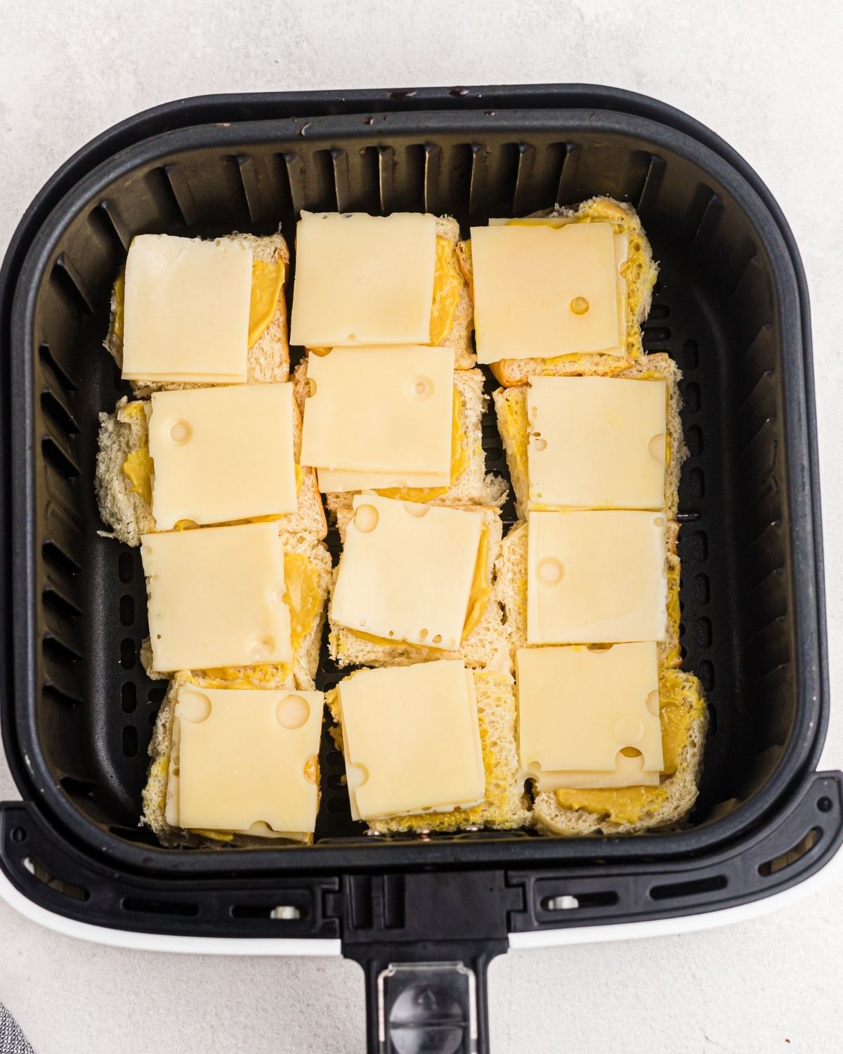 - Place the bottom halves of the rolls into the air fryer basket in a single layer. Fold the cheese slices and cut them in half before adding them to the roll.
