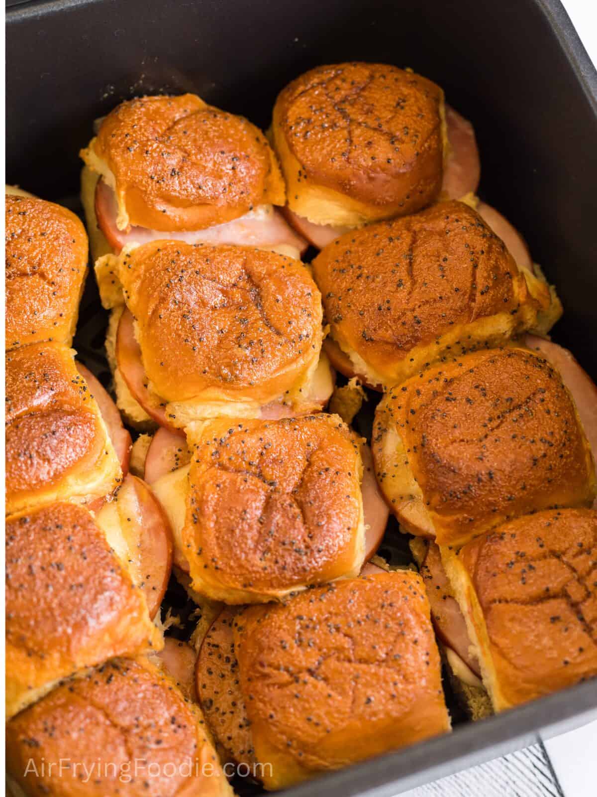 👩🏻🍳 Tip: If you’re making a couple of batches of these Air Fryer ham and cheese sliders, the second batch will need slightly less time to cook, thanks to all the preheating.