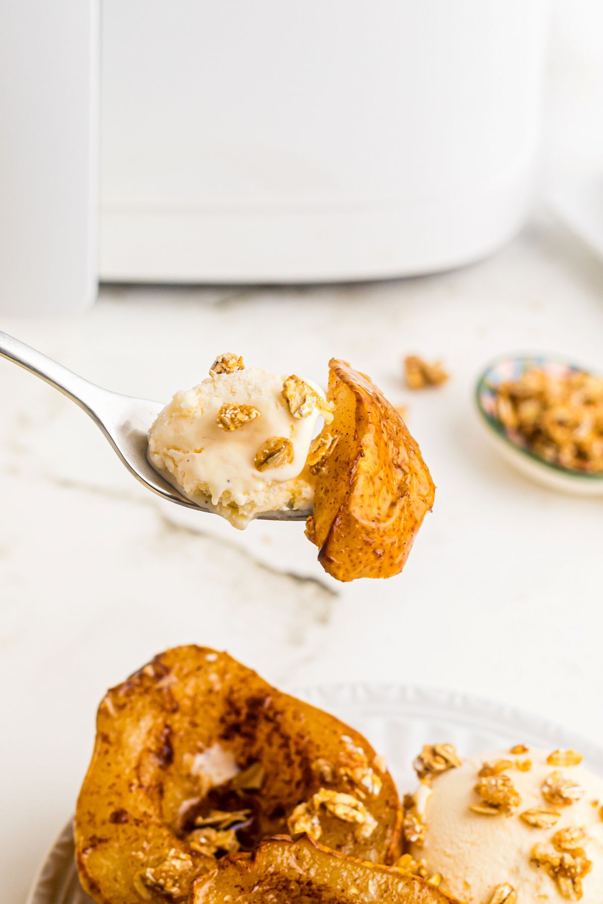 - The flavors are incredible. The juicy and sweet pears get air fried to perfection and topped with a dusting of butter and cinnamon for warmth!