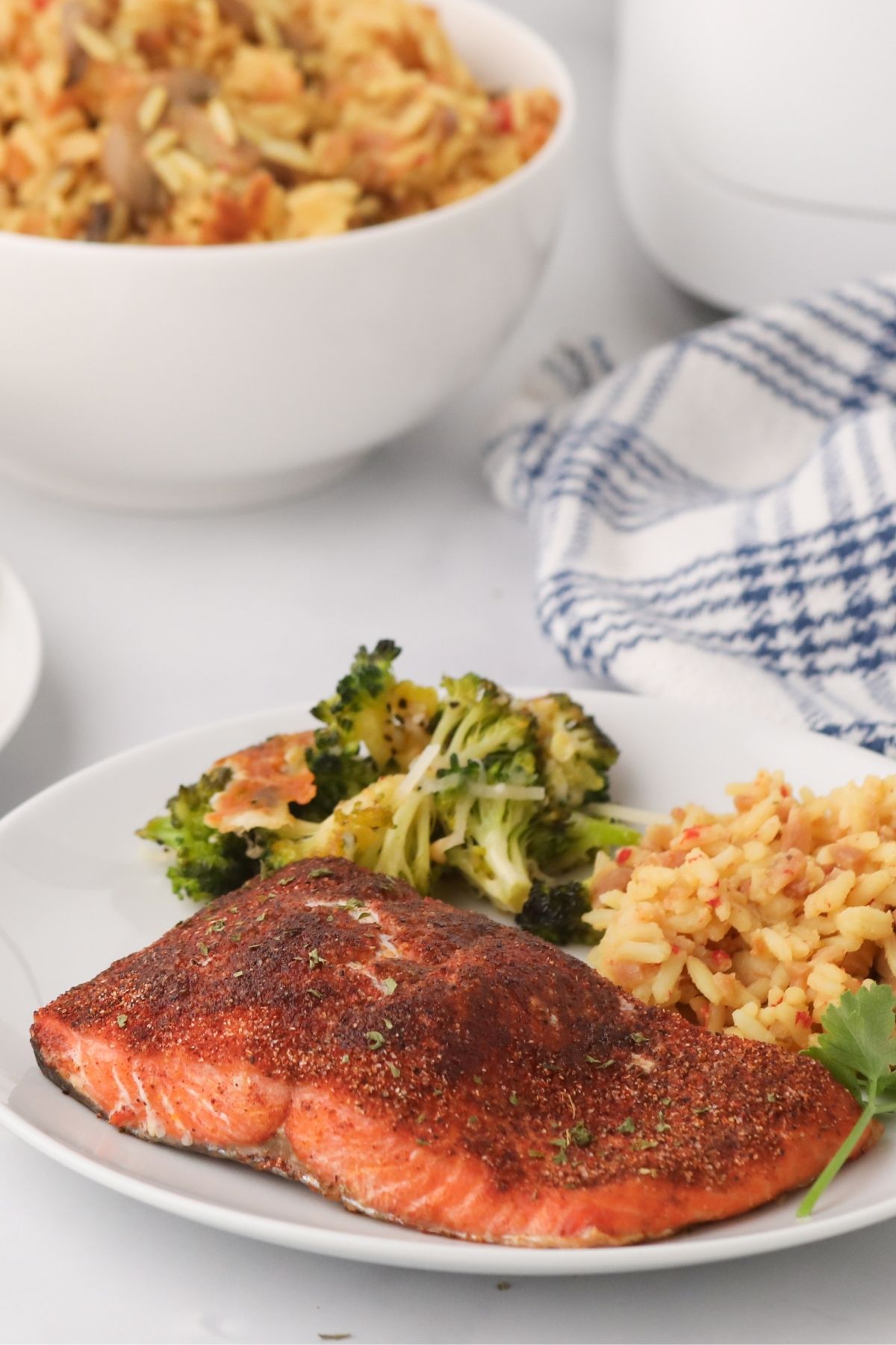 The texture is always perfect, and you don’t need a lot of oil to get that slightly crispy exterior too. And of course, the fact that it cooks SO quickly makes it perfect for a rushed weeknight meal. Pair your fish with a veggie side like Air Fryer asparagus or Air Fryer zucchini, a carb of choice, and dinner is done. And that’s exactly what this easy salmon recipe is too!